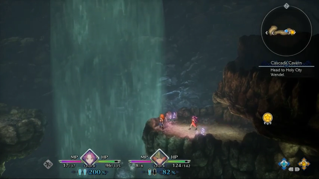 At the entrance to the cave, our hero meets their first companion who must also get to Wendel to see the Priest of Light. As the two make their way through, they may find Charlotte perilously hanging from an earthen bridge. If Charlotte was chosen as the third character, she is rescued and joins the party in thanks. If she was not chosen and is not the hero, she leaves toward Wendel and later catches up with them, but they ultimately refuse her.