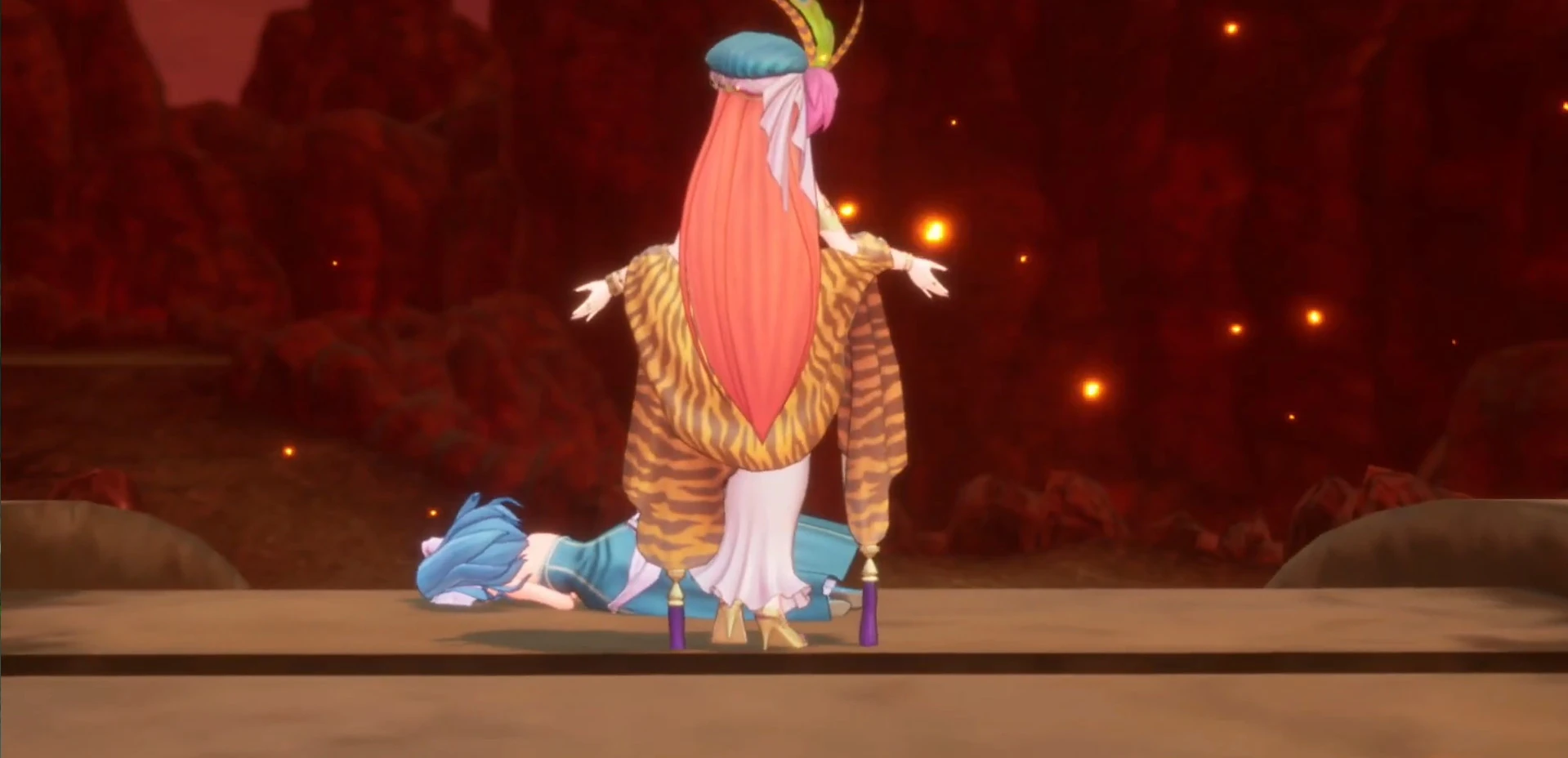 The heroes wind their way through the lower half of the lava-filled cavern, reaching the Firestone moments behind Belladonna. Having activated the Mana Stone, she has released Jessica from her curse. However, believing that the girl is still in danger, Hawkeye or fellow thief Niccolo rushes in and throws a drugged dart to distract her. Jessica is quickly evacuated and taken to Diin to recover from her ordeal. Meanwhile, Salamando appears and joins the heroes, hot-blooded as ever.