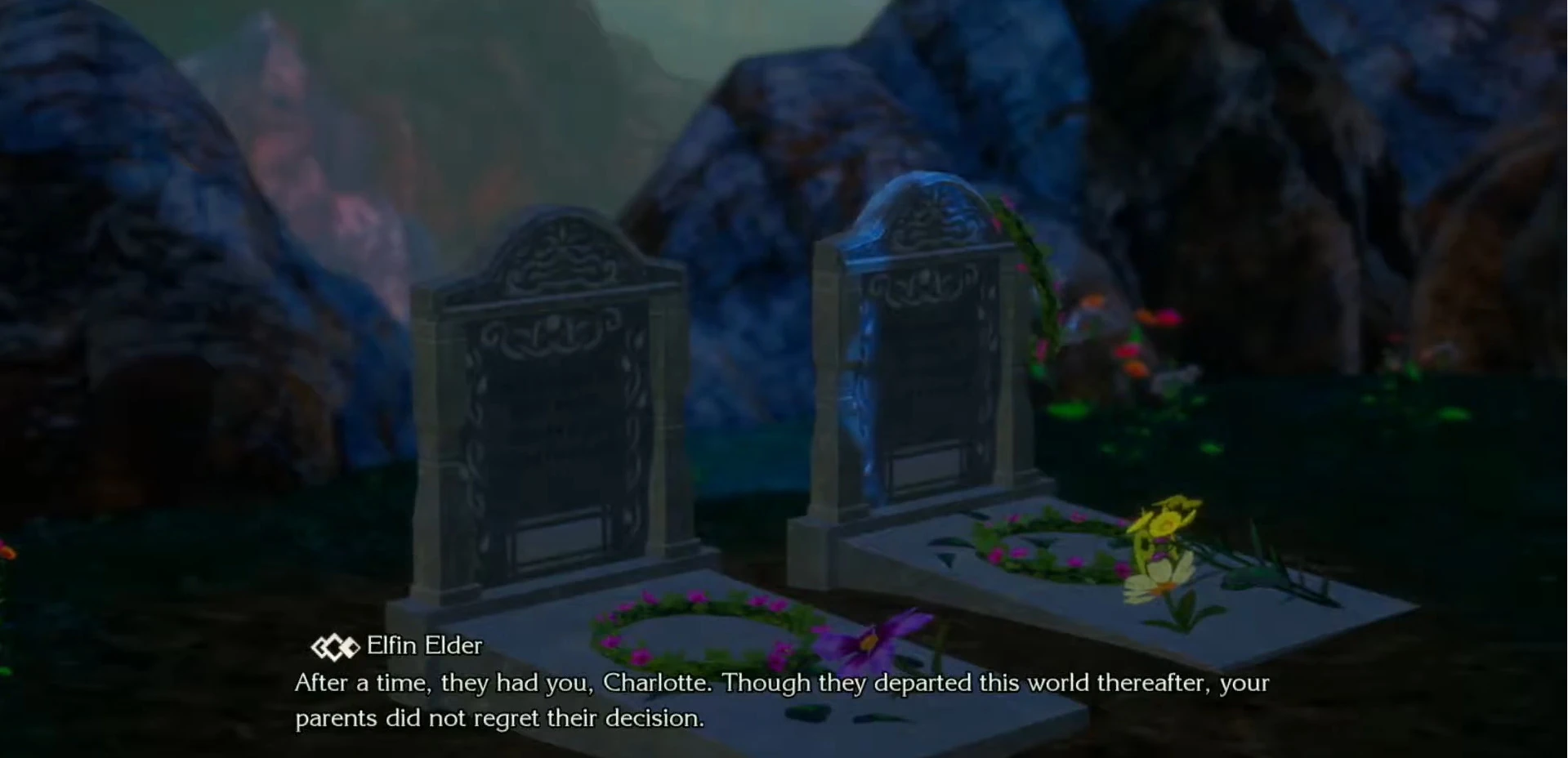 As our heroes approach the village, they are greeted with a deafening silence; it is long held that elves do not speak with outsiders. Left with little choice, the party proceeds to the manor on the western edge. Therein, they find the Elfin Elder, who is understandably surprised that humans have come. The heroes and Faerie explain their purpose, to which the Elder responds with Charlotte's origin story. Shocked to learn the truth of her circumstances, Charlotte retreats to another room to cry. The others comfort her, and the Elder orders his people to assist the Chosen with such things as they may need. In the process, he also grants passage to the northern reach of the forest; and so, the party heads there.