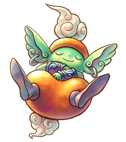 Jinn (ジン Jin), also known as Sylphid, is the Mana Spirit of Wind. He appears as a humanoid creature that resembles an Arabian-style genie. He holds a bag, which could be assumed to be a nod to his etymological origins. While his spells include wind powers such as air blasts, cutters, and tornadoes, they also include the powers of lightning, the ability to suspend enemies in the air temporarily, and of sound (evident through his Silence spell in Secret of Mana). One of his spells allows for the disarmament of traps and the proffering of information about specific targets, while his weapon enchantment makes attacks more likely to land critical blows. In Trials of Mana, he is granted Defense Down and Speed Up abilities so as to counter Gnome's hold on these powers in Secret of Mana.