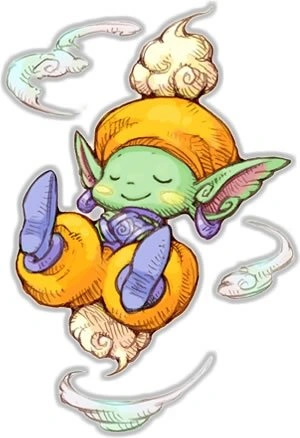 Jinn (ジン Jin), also known as Sylphid, is the Mana Spirit of Wind. He appears as a humanoid creature that resembles an Arabian-style genie. He holds a bag, which could be assumed to be a nod to his etymological origins. While his spells include wind powers such as air blasts, cutters, and tornadoes, they also include the powers of lightning, the ability to suspend enemies in the air temporarily, and of sound (evident through his Silence spell in Secret of Mana). One of his spells allows for the disarmament of traps and the proffering of information about specific targets, while his weapon enchantment makes attacks more likely to land critical blows. In Trials of Mana, he is granted Defense Down and Speed Up abilities so as to counter Gnome's hold on these powers in Secret of Mana.