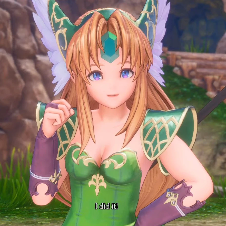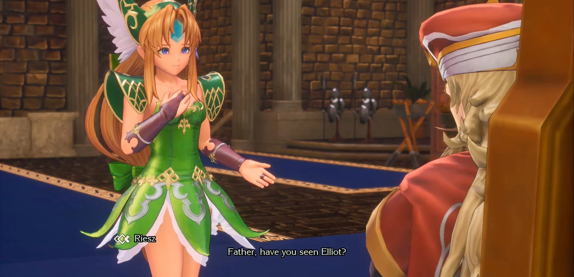 Nestled atop the highest mountain peaks, the Kingdom of Laurent is said to be impenetrable due to the strong winds surrounding the citadel, which act as a protective buffer against any interloper. Riesz, princess of Laurent and captain of the guards, is in the middle of a battle atop a neighboring cliff along with some amazons. After slaying the enemy, she feels the wind crying; the monster population increases day by day in the mountain. Returning to the citadel, Riesz focuses on finding her younger brother Elliot since it's time for his personal training. After several unsuccessful attempts, she ventures into the throne room to ask her blind father, King Joster, about her younger brother's whereabouts. The old man declares he's on the grounds and that he can clearly sense him. Riesz then tries to ask Alma if she's seen her brother.