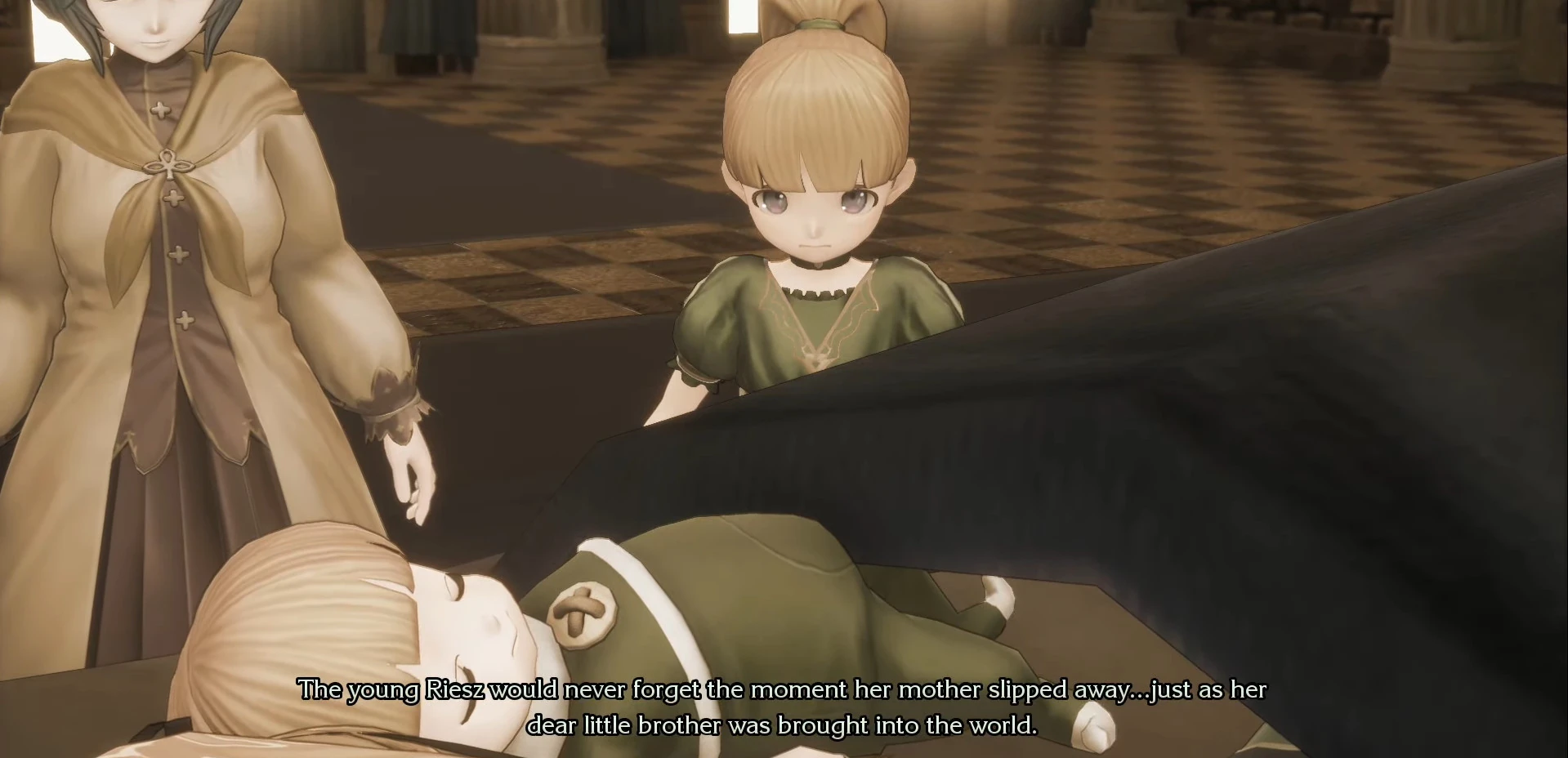 A grieving Riesz is seen exiting her hometown, now in shambles. Not knowing what to do, she recalls her father telling her that the Priest of Light has answers for those in need. She bids a final farewell to her country by entreating her late mother to take care of her father and fallen comrades, and that her mother's ribbon will protect her on her journey. Riesz then goes down the mountain path and takes a ferry to Jadd Stronghold.