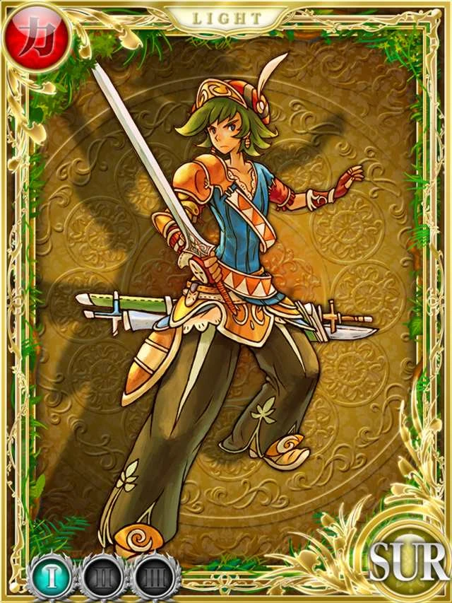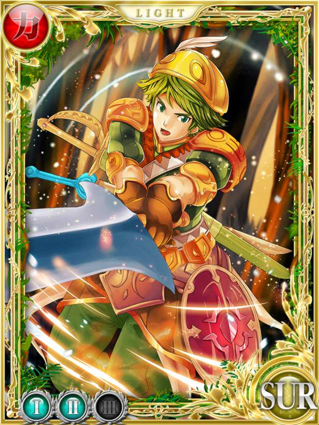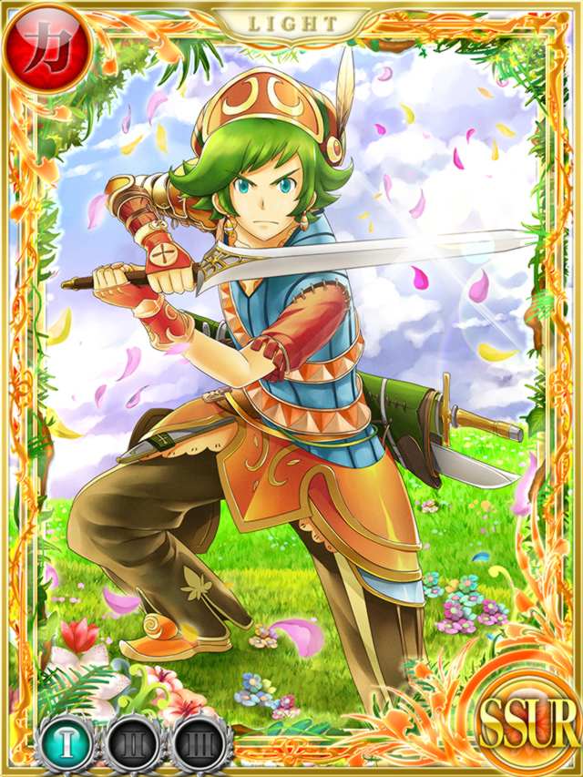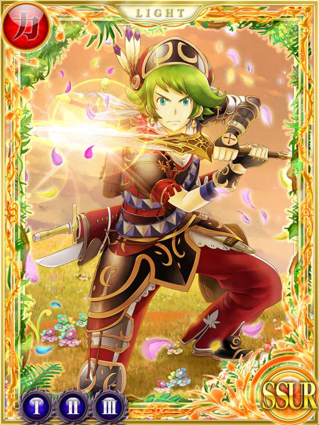 Roget wears an orange, gold and green feathered cap over his slightly dark green hair, which is spiked out either side of his head and strands fall in his face. He also wears a dark blue shirt with multiple armour pieces over his right arm, and on his left an orange tattered sleeve piece has been stitched on over the blue. Roget has an orange and white Peddan style strip that winds around his waist twice over an interesting piece of orange armour over his thighs. Hanging from this on the right is a piece of orange armour with a yellow strip. On his left leg are a few additional plates of blue metal. He also wears long pants that are a slightly more subdued colour than his hair, and have a single white strip on each leg. He wears orange and gold pointed shoes. On his left hand is a patterned glove. Roget also wears small orange gold striped earrings and a yellow ring on the middle finger of his left hand, most likely his engagement ring.