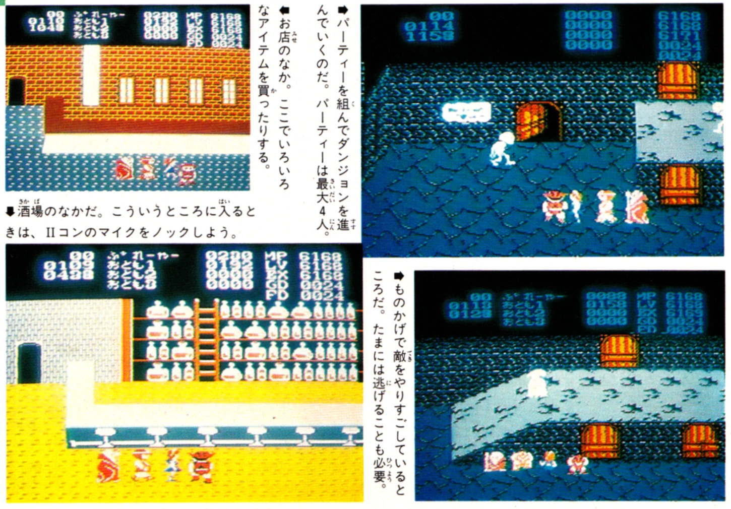 According to magazine advertisement, your party was made up of a maxium of four active characters. You could choose up to three characters in addition to the main hero, and your three fellow companions would automatically fight for you using AI. There were even some characters who were cowardly and ran away from enemies.[1]
