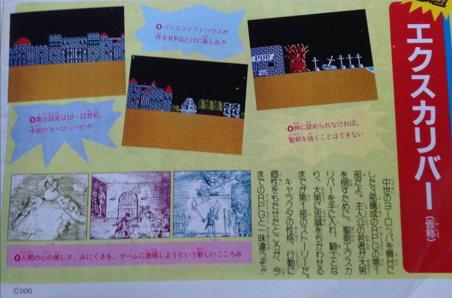 Sometime between 1985 and 1987, the game was advertised in Famitsu magazine as simply Excalibur. It was originally supposed to be an RPG trilogy for the Famicom Disk System and set in actual Medieval Europe.[6] Hiromichi Tanaka wanted the game to be something like a real-time version of Wizardry.[7]