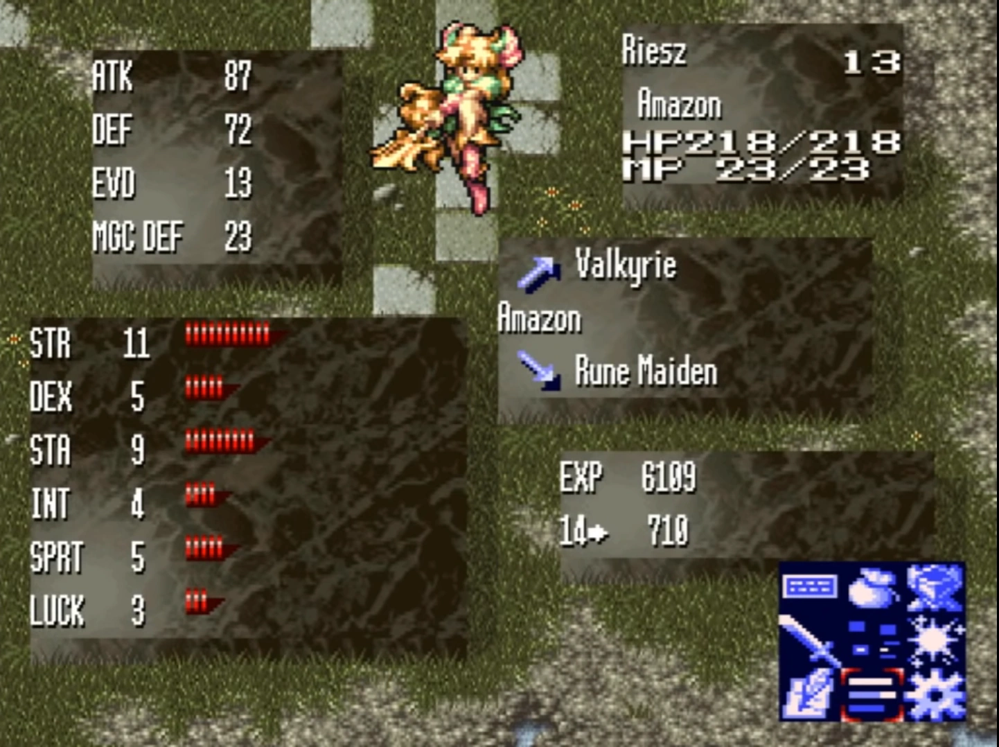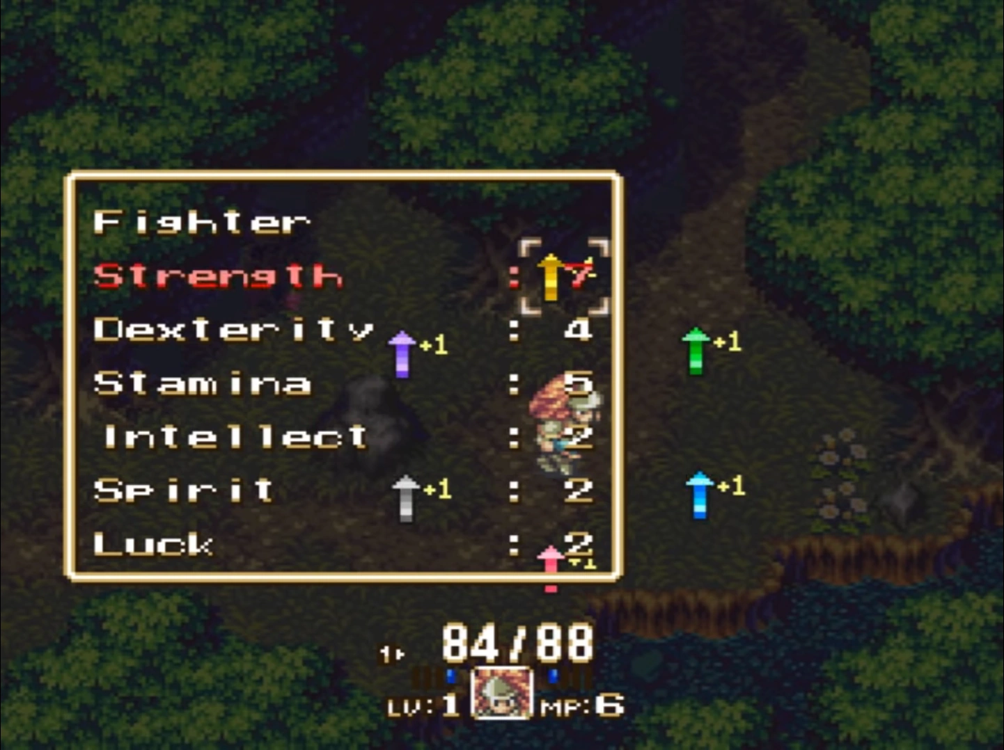 Whenever a player character levels up in the original 2D version of Trials of Mana, a pop-up ring menu is brought up prompting the player to choose which costumizable stat they would like to raise up a point. The player is effectively forced to choose and cannot quit the menu until a stat to upgrade is chosen. Each character class has stat caps that cannot be overlapped upon reaching it unless said character changes class.