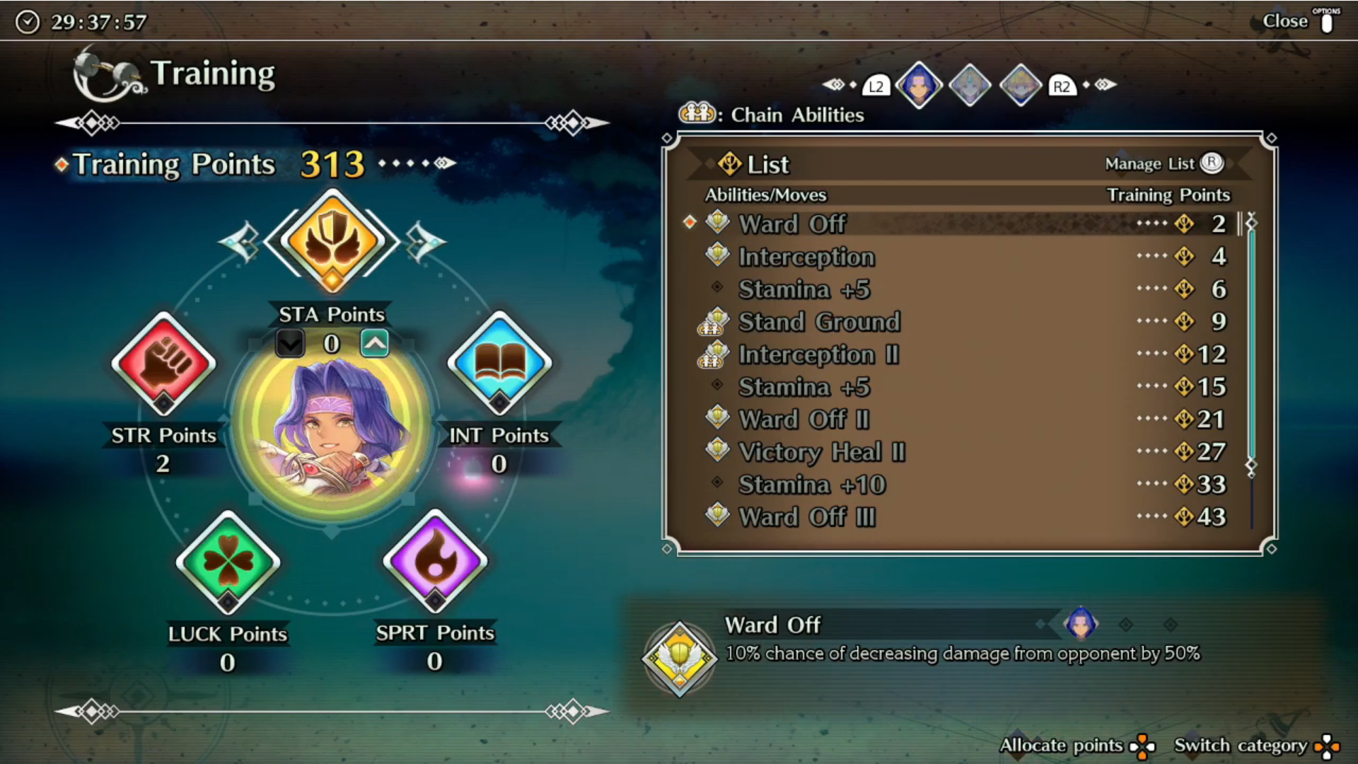 Whenever a player character levels up, training points or TP are allocated to it and can be used to gain moves or abilities that grant various upgrades and perks upon being equipped. Training points can be reinitialized at the Night Market by asking the phony Fortune-Teller.